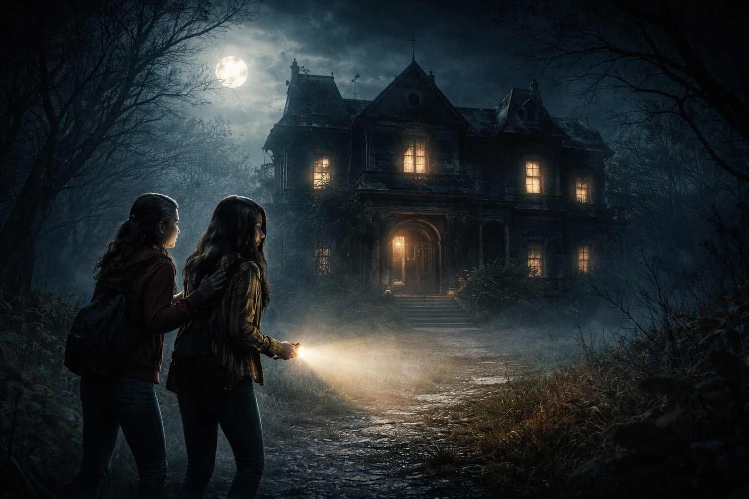 जैसे ही वे हवेली के पास पहुँचीं, रात की ठंडी हवा ने उनके बालों को हिला दिया। हवेली पुरानी थी। दरवाज़े चरमराते थे, खिड़कियाँ टूटी हुई थीं, और दीवारों पर लंबे समय से जाले जमे हुए थे। कुछ खिड़कियाँ टूटी थीं, और उनमें से अजीब रोशनी छनकर बाहर आ रही थी। हवेली के दरवाज़े पर जंग लगे हुए ताले अब भी लगे थे, और दीवारों की दरारें जैसे पुराने डरावने किस्सों को छुपा रही थीं।
